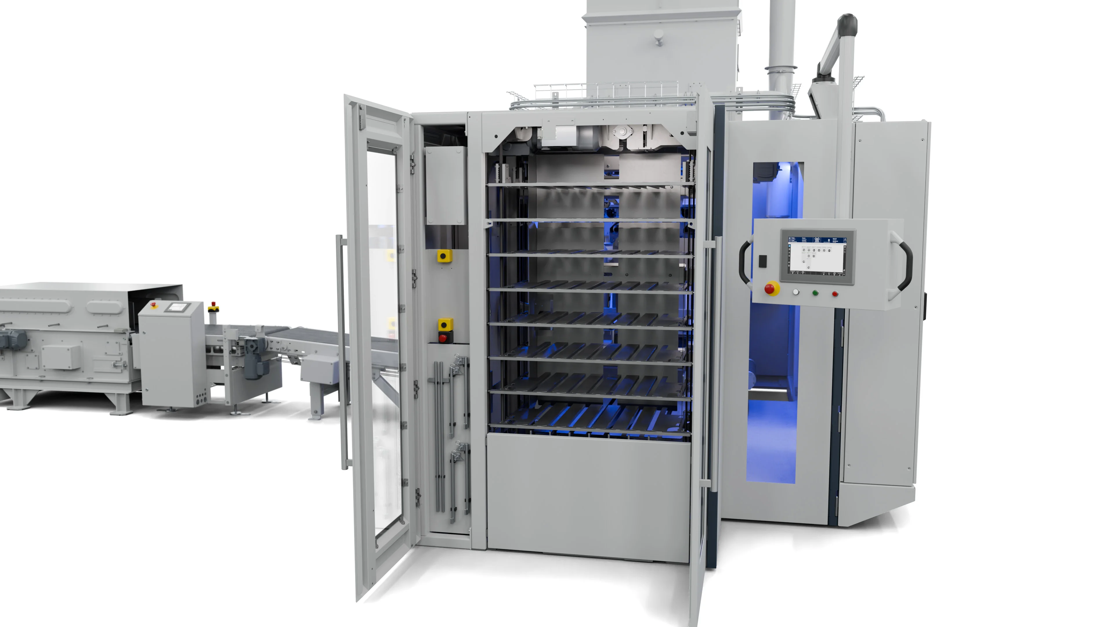 Swivel-mounted switch cabinets increase accessibility for maintenance and repairs. The pneumatics and cladding elements are centralized in one easy-to-access space with cables and hoses, designed to protect electrical components.