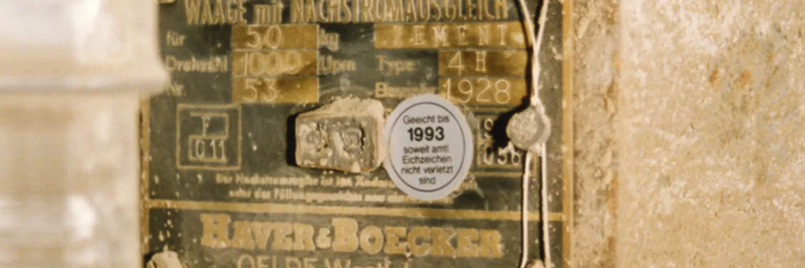 Haver & Boecker décida de reprendre la machine d’emballage, qui avait été construite en 1928. Il n’est pas courant que les machines d’emballage bénéficient d’une « période de grâce », mais la vieille ensacheuse a tout de même reçu un traitement spécial. Elle fut nettoyée et préparée afin de devenir une preuve vivante de la qualité et de la durabilité des produits HAVER en tant que pièce d’exposition. Pour que l’ensacheuse retrouve entièrement son équipement d’origine, les pièces ajoutées ultérieurement, comme le boîtier électrique prémonté, ont été retirées. La plaque signalétique indiquait non seulement que la machine était équipée d’une balance automatique avec compensation de débit en aval, mais affichait également la marque d’homologation jusqu’en 1993.