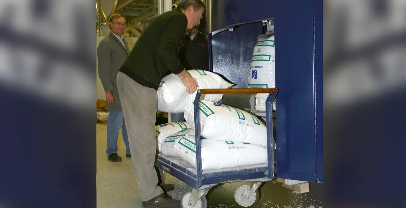 Les capacités d’ensachage toujours plus élevées de nos machines font la joie de nos clients, ainsi que celle de la plupart de nos collaborateurs, bien sûr. Mais il reste un petit groupe d’hommes dynamiques qui ont encore fort à faire : les employés du centre d’essais, l’actuel Institut HAVER & BOECKER. Lorsque des essais sont réalisés avec le FFS, les sacs remplis doivent être retirés du tapis roulant et placés sur un chariot. Cela nécessite non seulement des muscles puissants et une certaine agilité, mais aussi une grande rapidité, en raison des performances de plus en plus élevées. Ainsi, au début des années 2000, ces employés ont déclaré en plaisantant qu’il fallait bien en finir avec ces augmentations de performances, car « les efforts commençaient à être trop difficiles ». Le directeur de la division Chimie de l’époque, qui se faisait un plaisir de promouvoir les nouvelles machines auprès de la clientèle, ne voulait évidemment pas entendre de telles restrictions et les renvoyait à l’esprit d’innovation et à la vision de l’entreprise en matière de leadership technologique. Un jour, alors qu’il était assis avec des collègues après que la FFS ait dépassé les 2 000 sacs/h, il leur a fait la promesse suivante pour les motiver : « Si vous arrivez à dépasser les 2 500 sacs, je les porterai moi-même. »